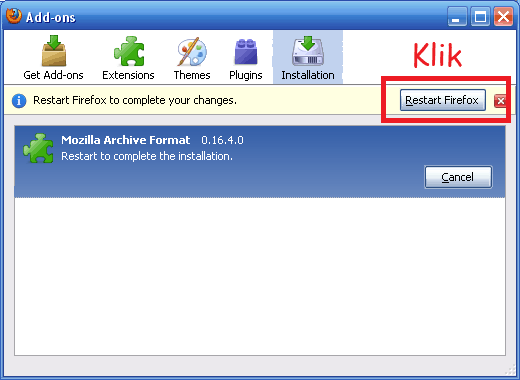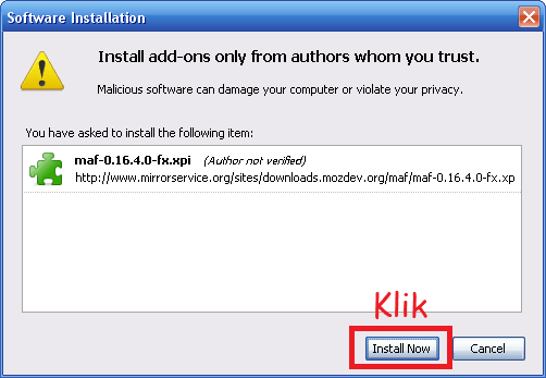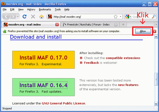 - Download add-on MAF (Mozilla Archive Format) dari http://maf.mozdev.org/. Pilih versi yang bukan experimental, yaitu versi 0.16.4 sewaktu tulisan ini dibuat. Klik Allow jika Firefox memblok instalasi MAF.