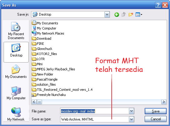 Dengan format MHT sewaktu kita menyimpan sebuah halaman web, hanya akan menghasilkan sebuah file saja dengan ekstensi *.MHT, sehingga lebih ringkas dan rapi.